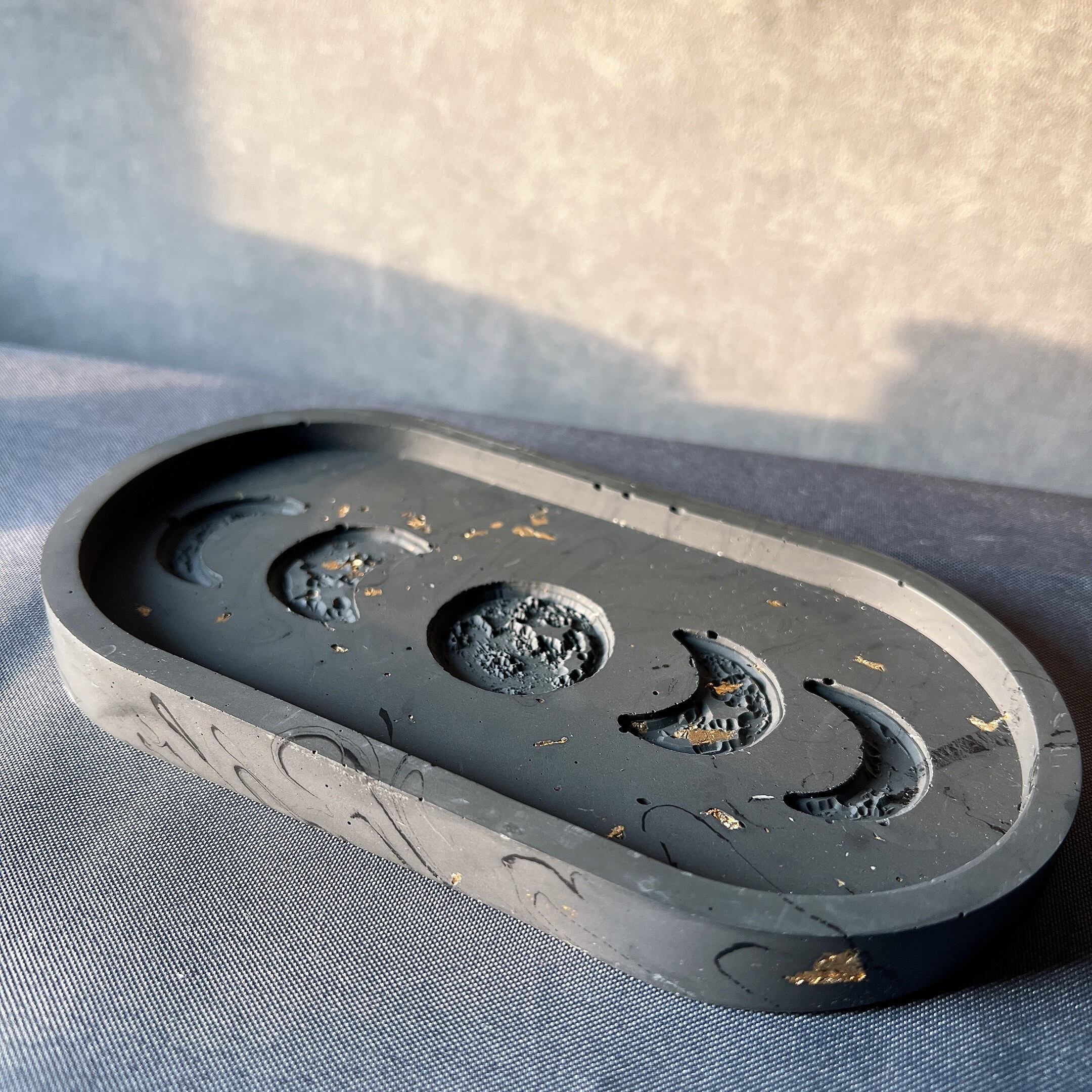 定番の人気を誇るオーバル形状で、月の満ち欠けをテーマにしたブラックトレイです。シンプルでありながら、存在感があり、美しい曲線がインテリアに華やかさを加えます。特に、スタイリッシュなデザインは男性からの支持も集めています。キートレイとしてだけでなく、オブジェとしてもお部屋の雰囲気を引き立ててくれる、魅力的なアイテムです。プレゼントにもぴったりです!